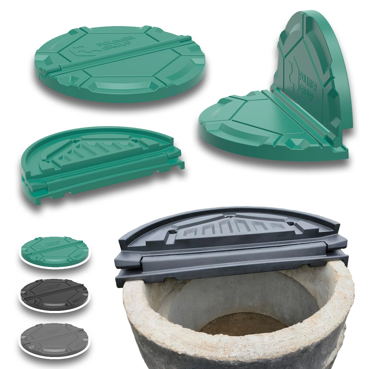 Складывающаяся пополам крышка для колодцев диаметром 1000 мм. Изготовлена из ударостойкого пластика.