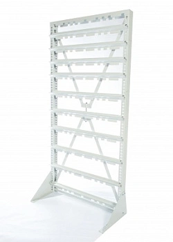 Стойка Стелла-техник V-735х1515мм. без опоры, серия К, для пластиковых ящиков, состоит из металлической рамы, снабженной крестовиной-растяжкой для жесткости конструкции. На вертикальных стойках рамы имеются перфорационные отверстия для закрепления поперечных держателей. Держатели крепятся к раме с помощью саморезов. Высоту держателей можно изменять в зависимости от высоты закрепляемых пластиковых ящиков. В случае необходимости, стойка может закрепляться на передвижной платформе, специально предназначенной для этой цели. В комплект поставки входят: Вертикальная стойка перфорированная 2 шт.; Верхняя планка-опора 1 шт.; Полукрестовина для стяжки стойки 2 шт.; Шпилька резьбовая диаметр 8мм. для стяжки полукрестовин 1 шт.; Гайка М8 для шпильки резьбовой 2 шт.; Шайба М8 для шпильки резьбовой 2 шт.; Саморезы диаметр 6мм. на 1 держатель 2 шт.
