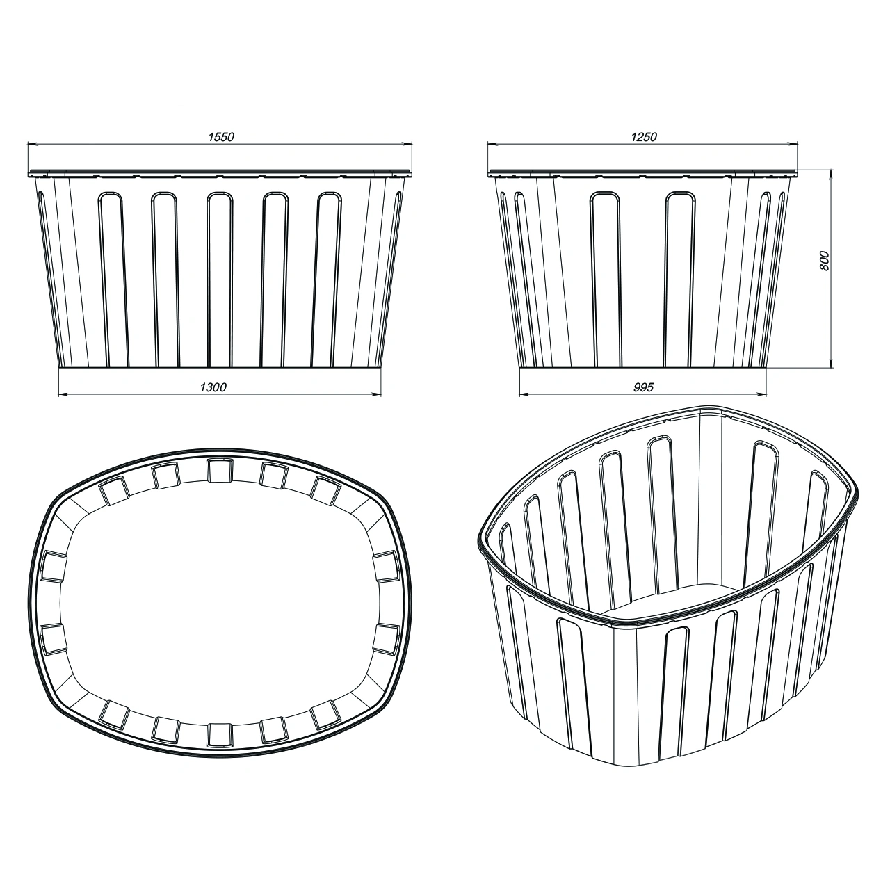 Форма ванны заужена в нижней части, что позволяет складывать ванны одна в другую (штабелировать), что упрощает транспортировку и хранение.